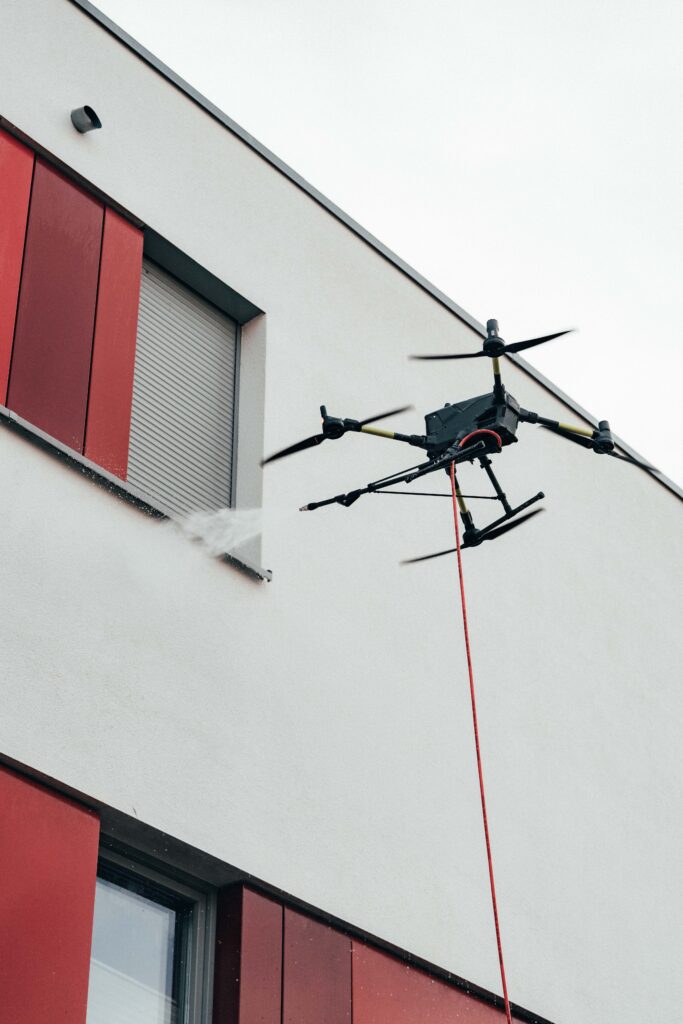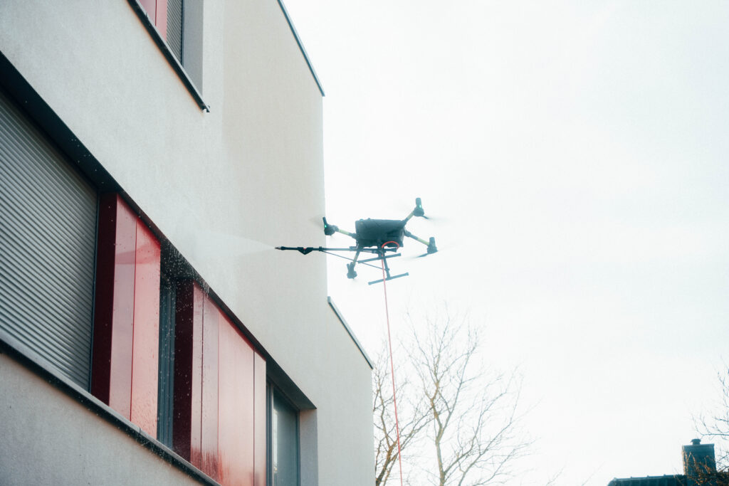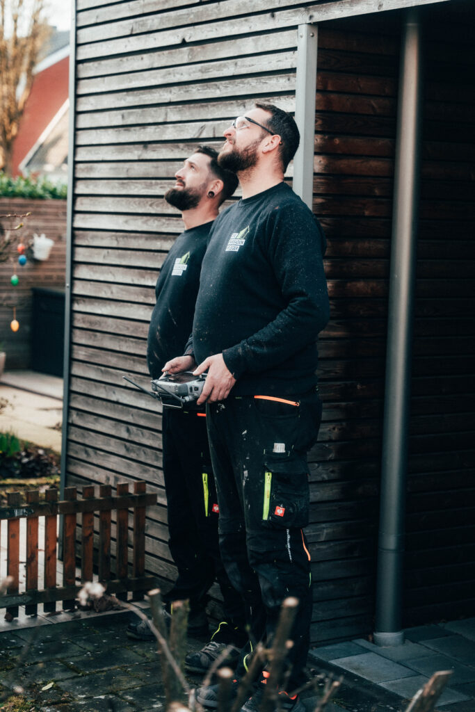 Anstatt aufwendig mit Gerüst und großem Zeitaufwand zu arbeiten, reinigen wir Dächer effizient mit modernster Drohnentechnologie.